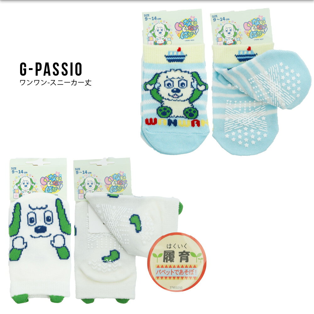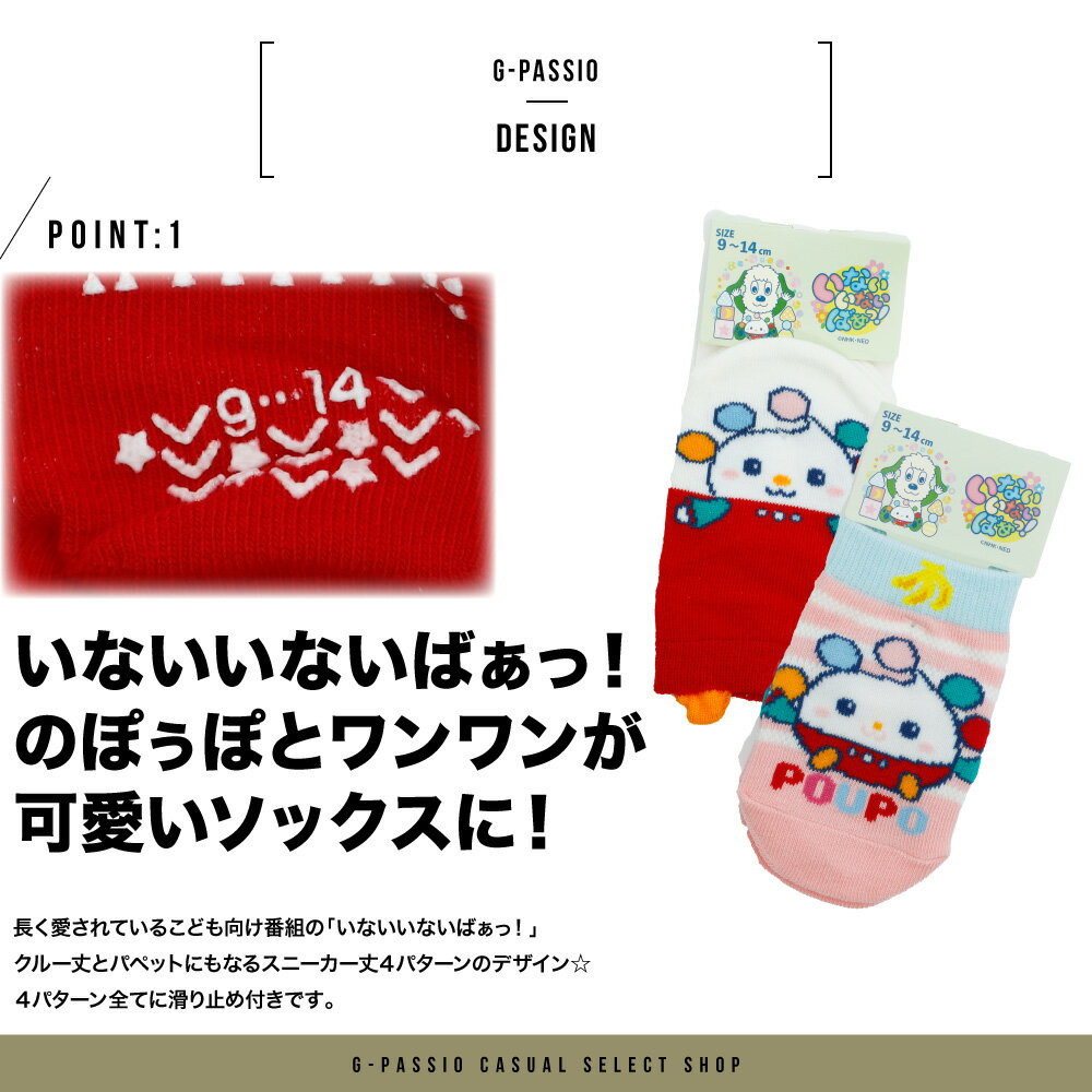 いないいないばぁっ ベビー ソックス 靴下 スニーカー丈 クルー丈 2足組 履育 パペット スベリ止め付き 12〜15cm うーたん ワンワン ホワイト クリーム イエロー ピンク グリーン